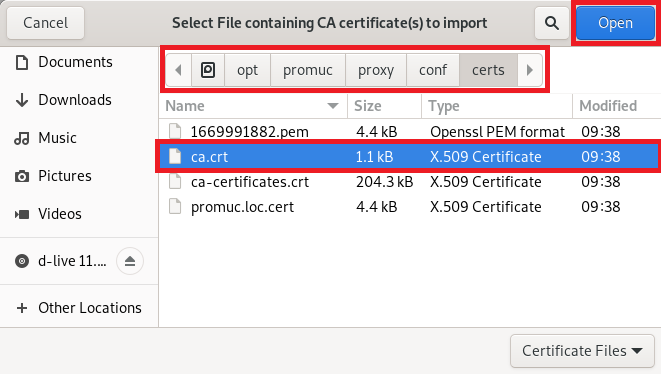 /opt/promuc/proxy/conf/certsи выберите сертификатca.crt, нажмитеOpen: