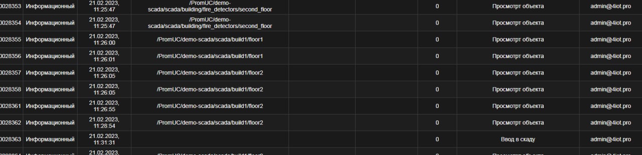 отправка команд (с меткой времени в UTC формате, объект управления, результат выполнения)
